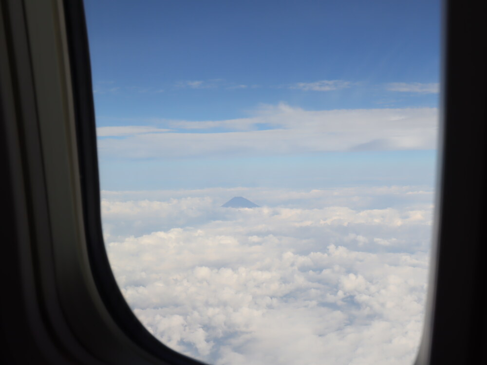 黒いけど富士山が向こうに見える!この日は雲がやや多くて飛行航路ちょうどに雲がいる感じで、雲の上や下を飛んでいる感じ。9月は台風シーズンだけど今年はほとんど台風が寄ってこなくて、無事飛んでよかった。7時40分発の8時50分着の50分のフライト。