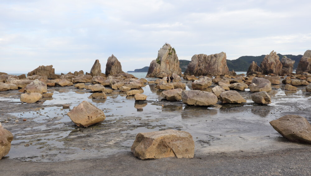 飛龍神社から車で1時間弱、16時に橋杭岩(はしぐいいわ)へ。隆起した火山岩が浸食によってやわらかい堆積岩の部分が削られて硬い火山岩の部分だけ残って、それが橋杭のようなことからそう呼ばれているところ。本当はもうホテルでゆっくりしている予定の時間だったみたい。17時までビールが飲み放題のホテルだったのに、もう間に合わない。