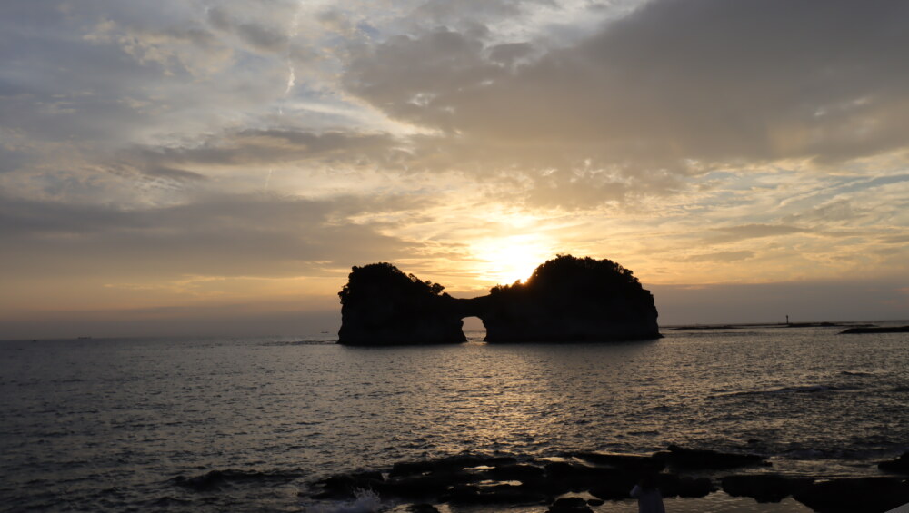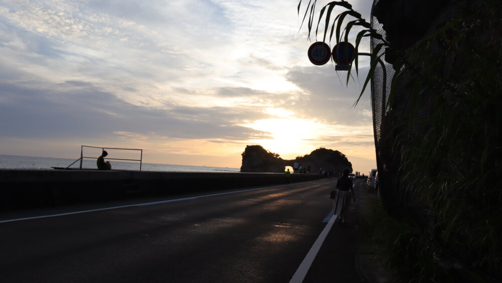 橋杭岩から1時間15分、夕陽スポットである、円月島(えんつきとう)へ着いたのは17時半。ホテルに戻ってから行く予定が、大幅に遅れ、直接行くことに。するとベストポジションに中国人らしき人がいっぱい。あの真ん中にちょうど太陽が来る日だったんだって。みんなよく知ってる。