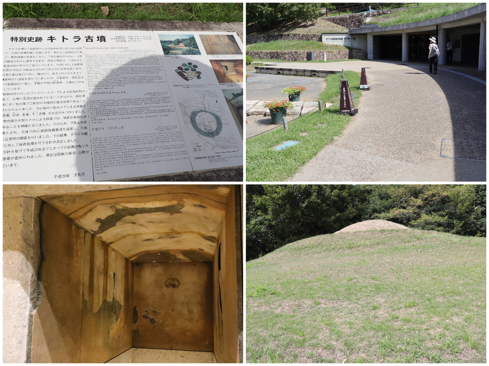 ホテルに水筒を忘れて取りに帰るという時間ロスもあり、宿から車で2時間半、奈良県のキトラ古墳へ移動。9時40分くらいにホテルを出て着いたのは12時15分ごろ。道の駅があるけど、そこに良いお昼ごはん場所がなくて、キトラ古墳へ直行。併設している「キトラ古墳壁画体験館 四神の館」は綺麗で、割と面白かった。キトラ古墳の実物自体は、、こんなもんかという感じ。これ以上近づけないし土が盛られていて中に入ることはできない。何より9月も終わりなのに30度くらいあって、めちゃくちゃ暑くて、外は日陰がないので、日傘必須。夏に古墳の観光は難しいと知った。