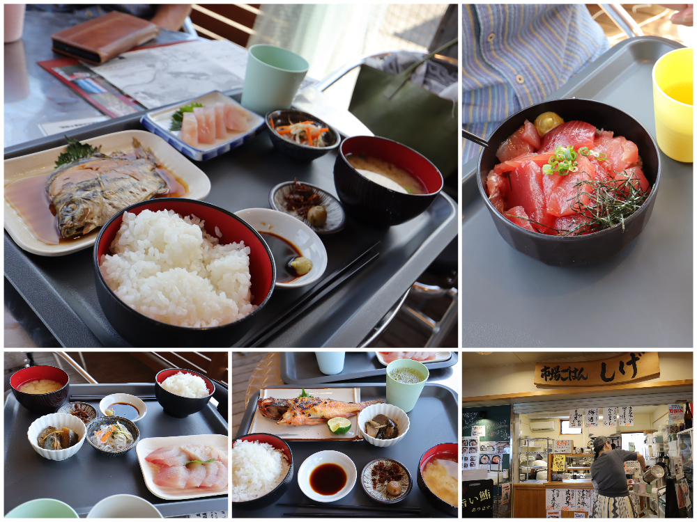 紀伊勝浦駅前から歩いて4分のところにある、商業施設「勝浦漁港にぎわい市場」でランチ。値段は観光地価格。一番手頃なお店「市場ごはん しげ」で注文。タッチパネル式で、そのタッチパネルが全部のお店が一緒になっているのですごく分かりづらい。事前にYouTubeでわかりづらいことを知っていたのでなんとか注文できた。11時30分だったので席は座り放題。机はあんまり綺麗じゃないので、ウェットテッシュとか持って行った方がいいかも。