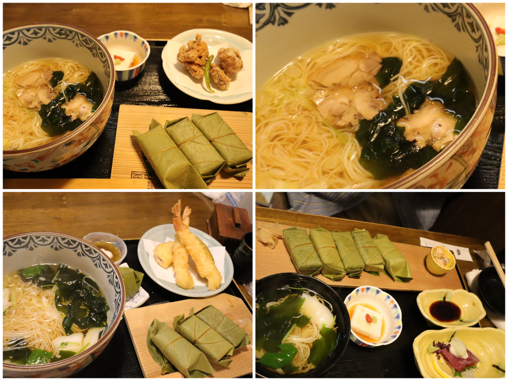 注文したのは、まほろば2,790円で胡麻豆腐と刺身、三輪素麺、柿の葉ずし5個に白玉団子がついたもの、煮麺膳2,100円で三輪素麺と天ぷら、柿の葉に包まれたおはぎが着いているセットで、天ぷらもおはぎも美味しかったらしい。私もこれにしたら良かったな。私が頼んだのが大和地鶏膳1,900円で唐揚げと三輪素麺ににゅうめんと柿の葉寿司3つと胡麻豆腐のセット。予想、想像通りの味。まあ、修学旅行以来の奈良だという両親には奈良っぽいものでよかったんじゃないかな。