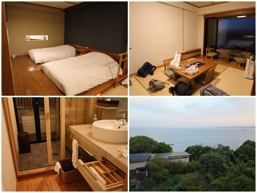 円月島から車で10分、本日の宿「浜千鳥の湯 海舟」へ。ドーミイン系列の高級宿。入り口から高級感ある宿で、全て畳で靴は入り口で脱ぐ方式。もっと早く着いてゆっくりできなかったのが少し心残りではある。海が見えて、露天風呂(温泉でない)が着いているお部屋。波の抄和洋室の41平米 (和洋室)で44,220円(22,110円/人)。