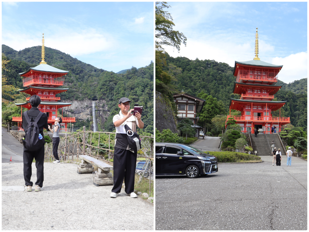 10分弱歩いて写真スポットへ。ここを少し降りたら、駐車場がちょっと先でつながっていて、青岸渡寺の駐車場のようで、ここも車で行けたみたい。滝と三重塔の写真を撮ったら、今度は那智の滝のすぐ近くへ移動します。ここからも歩けるよって書いてあるからすぐそこなのかと思ったら、事前に調べた母から20分くらいかかるとの情報。まあ、歩けなくはないができればショートカットしたい、、とのことで車で那智の滝がある、飛瀧(ひろう)神社のところまで戻ります。車で5分。