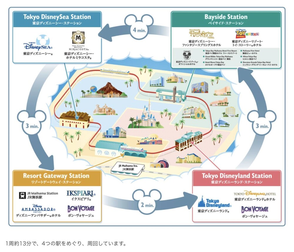 舞浜駅から徒歩でディズニーシーに行こうとすると18分くらいかかる。また、ディズニーリゾートラインは一方通行の電車なので隣駅だけど逆方向に行くため3駅。