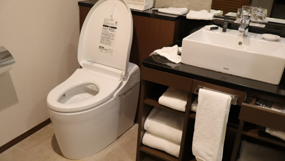 トイレと洗面所が同じ空間にあるタイプ。綺麗だし広いから不快には感じないけどちょっと不便かな。