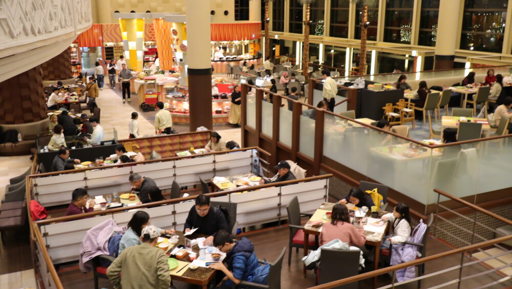 美味しかったのは、昨日の夕食バイキングと一緒で、シーザーサラダ。あとはソーセージ。クロワッサン、チュロス。人気だといううどんは、出汁が美味しいのかな。