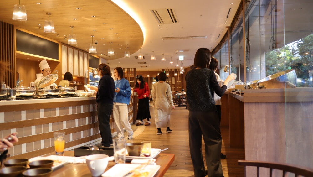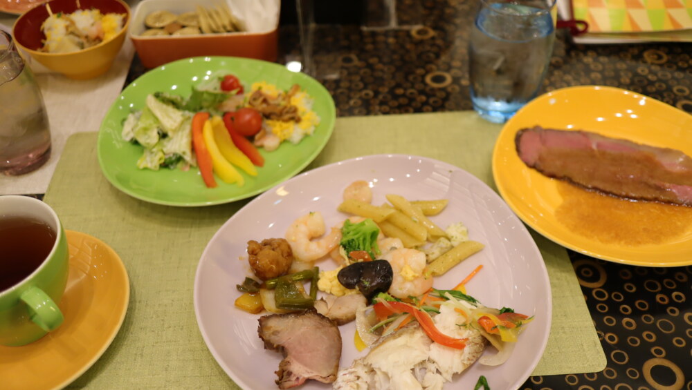 夕食はバイキングプランを予約。営業時間が17:00~23:00 まで (ラストオーダー22:30)と夜遅くまでやってる。好きな時間に行っていいとのことでありがたい。場所は1階のグランカフェという一番大きな場所。18時に行ったけど、待つことなく席に通された。席もゆったりしていていい。メニューが多く、広々としていて料理をとるのにストレスもなくて良かった。
