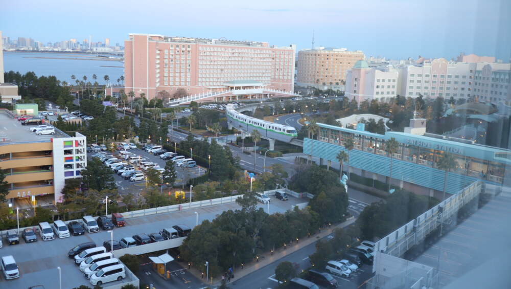 右側にはディズニーリゾートライン「ベイサイドステーション」駅が見えました。あと奥にスカイツリーが見える。