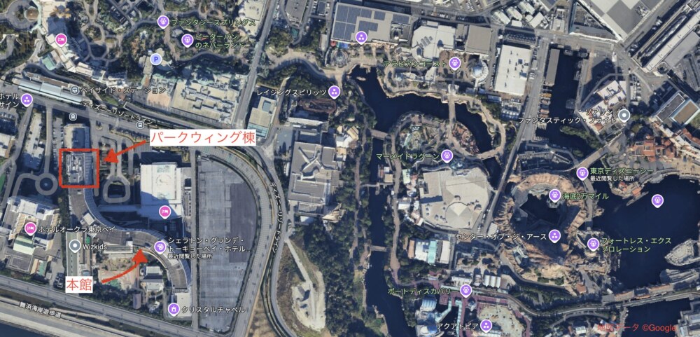 地図で見ると、ディズニーシーのすぐ近くにあるホテルだけど、そこから出入りはできなくて、ディズニーシーの出口は2カ所ではあるんだけど、その2箇所はすぐ近くでほぼ1箇所、ディズニーリゾートラインで一駅2分、東京ディズニーシー・ステーションで下車し、そこから2分くらい歩くと入り口に行ける。