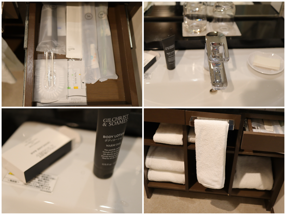 アメニティは、カミソリ、クシ、歯ブラシ、シャワーキャップ、クレンジングジェル、洗顔、化粧水、乳液、綿棒。分厚く吸水の良い、ハンドタオル、フェイスタオル、バスタオルが3人分。足りなかったらフロント前から持ってくることもできる。無臭の石鹸と、ボディーローションが置いてあったが、シャンプーと同じシリーズなので使わなかった。