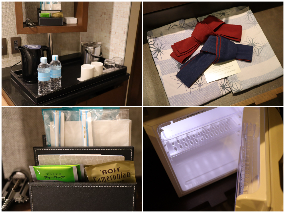 無料の水のペットボトルが人数分、煎茶と紅茶、コーヒーも人数分、氷入れ、ケトル、マグカップとガラスのコップも人数分。浴衣も人数分あって部屋以外では着ていったらダメみたい。冷蔵庫は空っぽ。