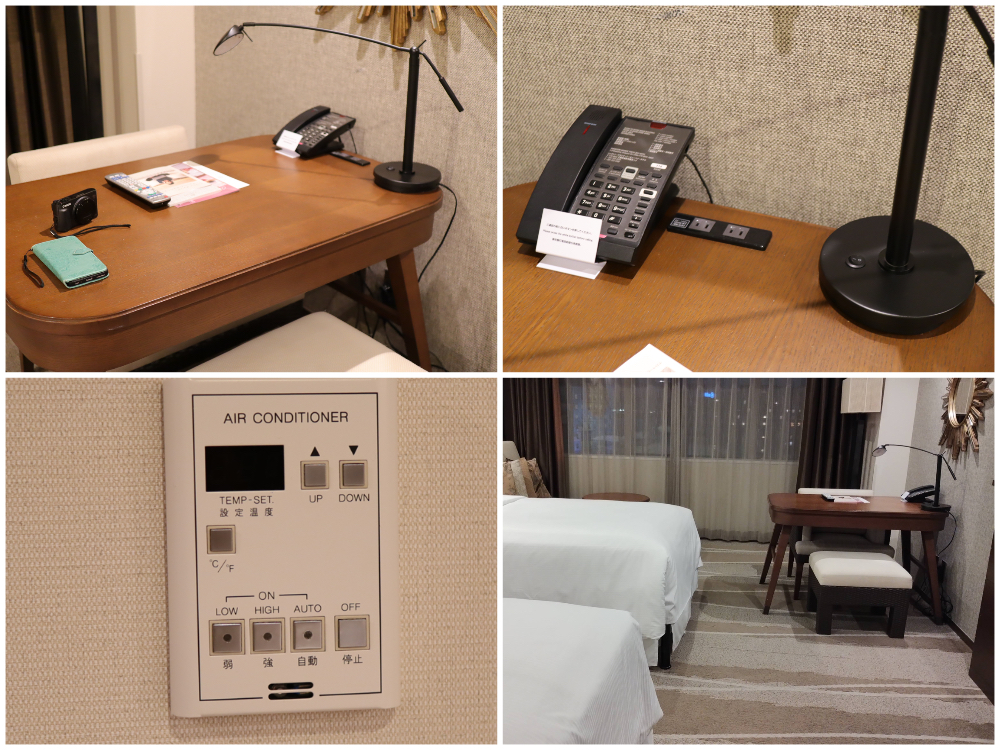 広々とした机、コンセントも充実、エアコンも温度調整可能。奥にあるソファーも座り心地がすごく良かった。
