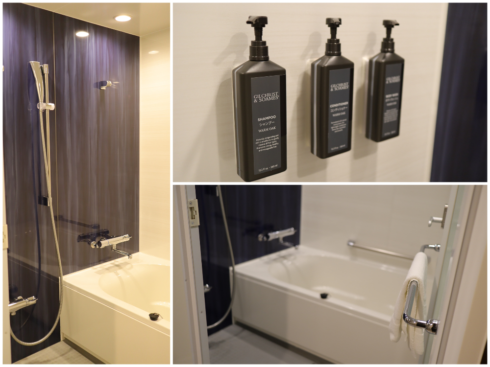 洗面所の部屋の奥にあるお風呂。トイレと別なのはありがたい。少し浅く長いので寝湯ができる。バスマットも厚みがあり良い。シャワーも問題なし。ただ、ここに備え付けのシャンプー、コンディショナーとも良くある海外の人の香水の匂いがちょっとして少し嫌だった。