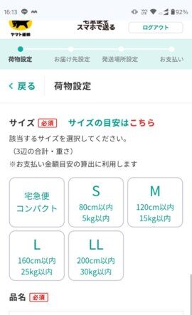 宛名の作成は、「宅急便をスマホで送る」というスマートフォン専用サービスで登録。クロネコメンバーズに入会すると住所がいくつか登録できて便利。通常の荷物を送るで、宅急便コンパクトを指定して、送付情報を登録する。「宅急便をスマホで送る」で送り状を作ると配送料が1つにつき60円引きになる。