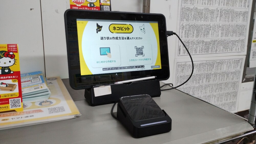 ヤマトの営業所だと、営業所に置いてある「ネコピット」で2次元コードから作成するをタッチして「宅急便をスマホで送る」で発行されたQRコードをかざすと、シールの送り状が出てくる。それを営業所の窓口に提出するだけで発送できる。