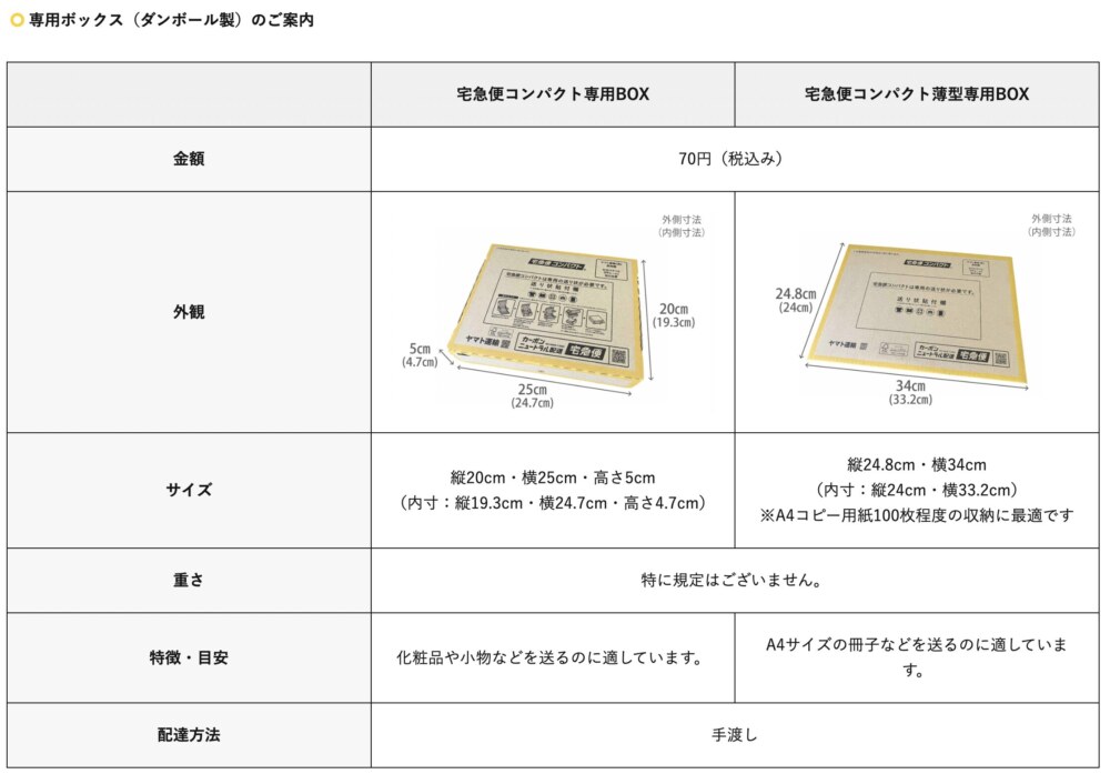 クロネコヤマトがやっている60サイズ(縦+横+高さの合計が60cm)より小さな荷物をお得な値段で送れる配送サービス。再利用不可の使い捨ての専用ボックスの購入が必要となるけど、家まで無料で届けてくれて便利。専用ボックスは箱型(20×25×5cm)と薄型(24.8×34cm)の2種類。